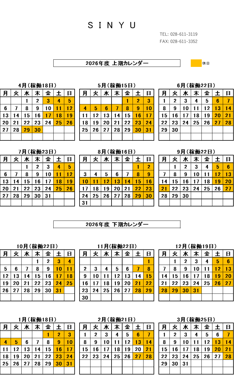 2026年度年間カレンダー